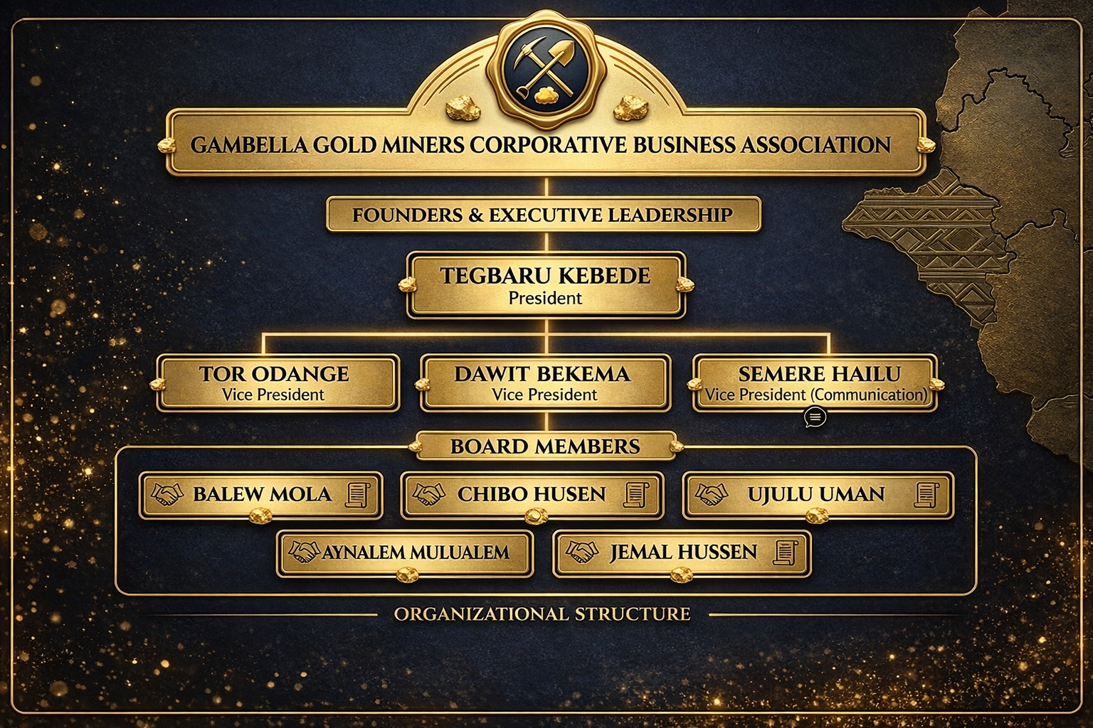 The Gambela Gold Miners Cooperative Business Association (GGM-CBA) is dedicated to empowering local gold miners, promoting sustainable practices, and advancing community development. Our mission is to create a unified and prosperous gold mining sector in Gambela, providing access to essential resources and innovative technologies. Join us in transforming the future of mining in our region.